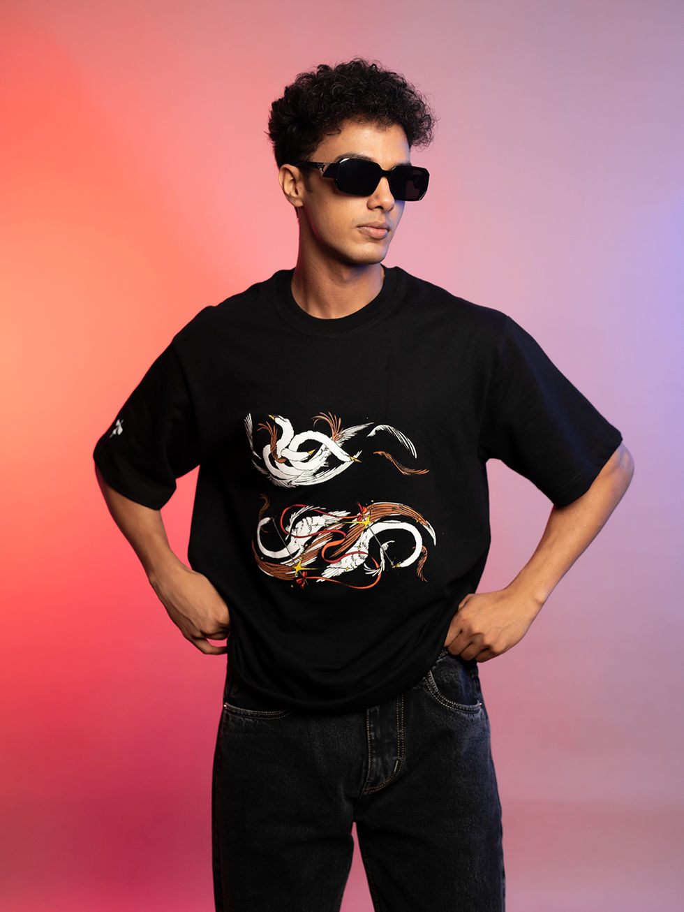SWAN PRINT OVERSIZED BLACK T-SHIRT